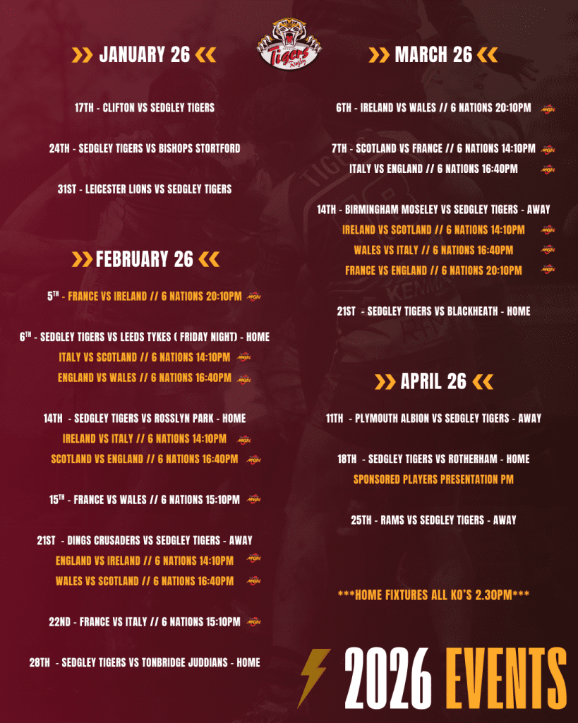 ⚡🏉 2026 SPRING EVENTS CALENDAR IS HERE! 🐯⚡ It’s shaping up to be a HUGE few months at Sedgley Park Tigers, packed with big home fixtures and every minute of the Six Nations LIVE at the club. 🔥 What’s coming up: 🏠 Loads of Home Matches at Park LaneIncluding clashes...